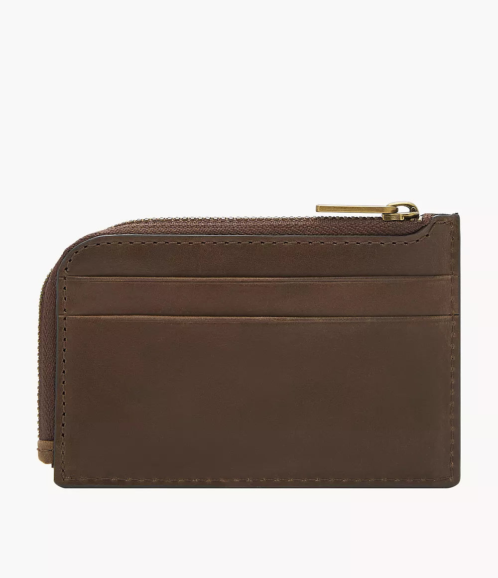 Este tarjetero de cuero con cremallera incluye un monedero con fuelle, un bolsillo deslizante y dos ranuras para tarjetas de crédito.