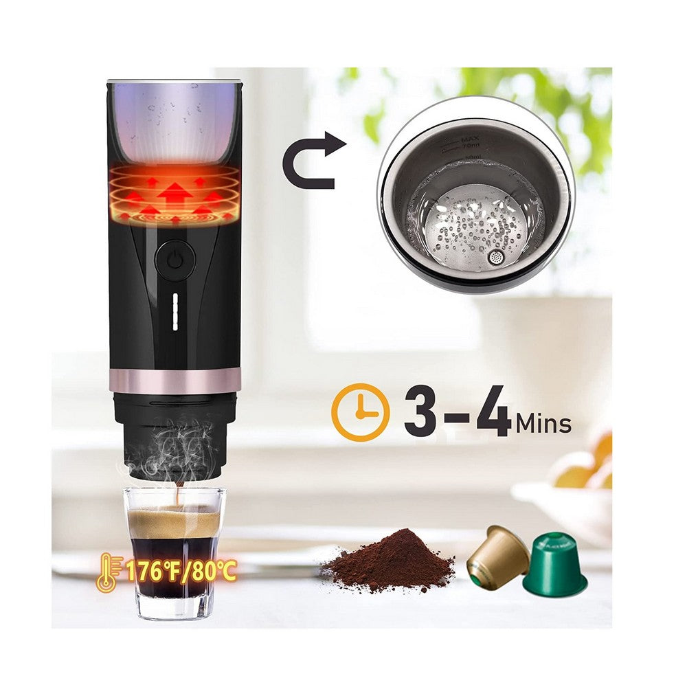 - Calentamiento rápido y potente: esta cafetera de espresso portátil cuenta con tecnología de calefacción de cerámica y prepara café espresso (176.0 °F/176 ℉) en 3 ~ 4 minutos. 20 bares de presión mantienen la cápsula/café molido extraída perfectamente y garantiza que el espresso tenga una rica crema y aroma. El tanque de agua de acero inoxidable de volumen de 2.7 fl oz permite preparar espresso de 1 a 2 onzas a la vez. Compatible con cápsulas NS y café molido.