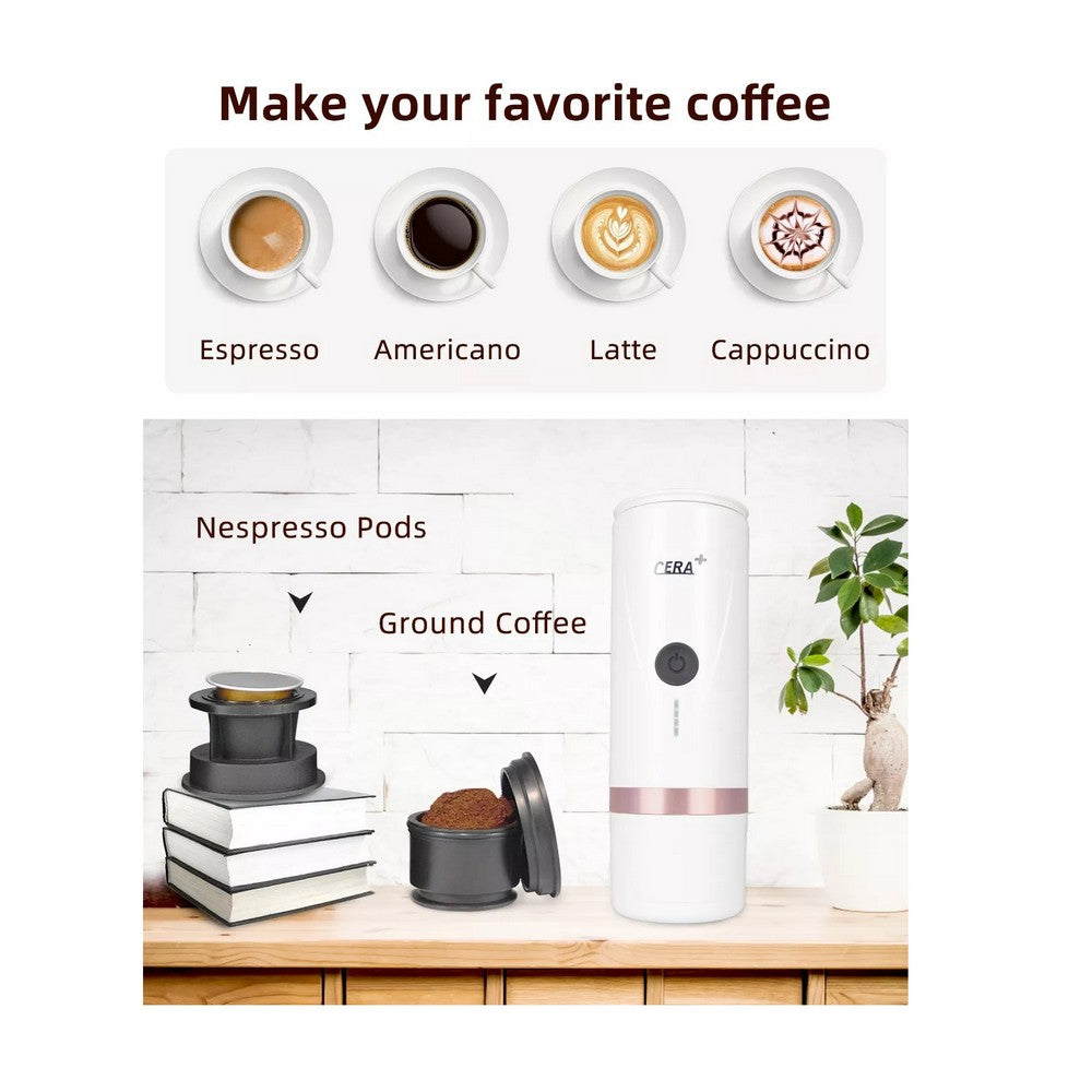 - Capacidad: Ligero y portátil: peso: 1.4 libras y altura: 8 pulgadas. La cafetera portátil CERA+ es la máquina de espresso eléctrica más compacta con función de calefacción en el mercado actual. Viene con una bolsa de transporte protectora, es conveniente para llevar tu cápsula favorita o café molido sobre la marcha.