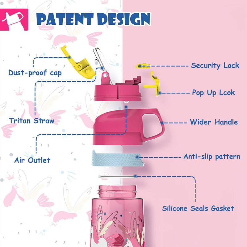 - Plástico Tritan 100% libre de BPA y de grado alimenticio. Además, la botella ligera para beber está hecha sin plomo, lo que es aún mejor para la salud de los niños. También está certificada por LFGB y FDA.