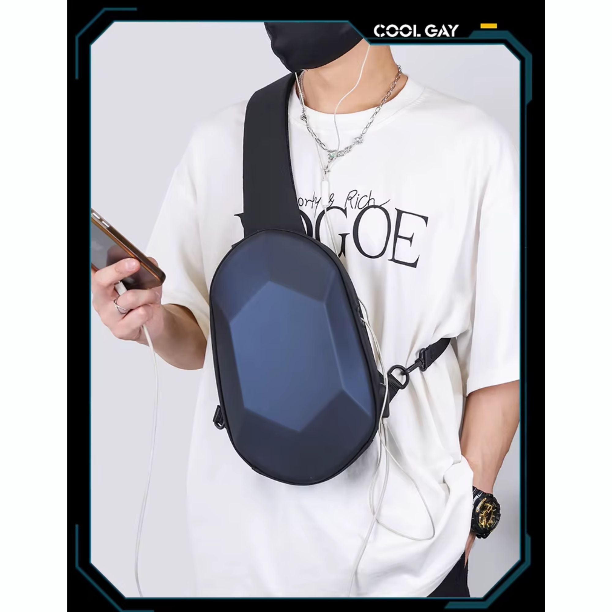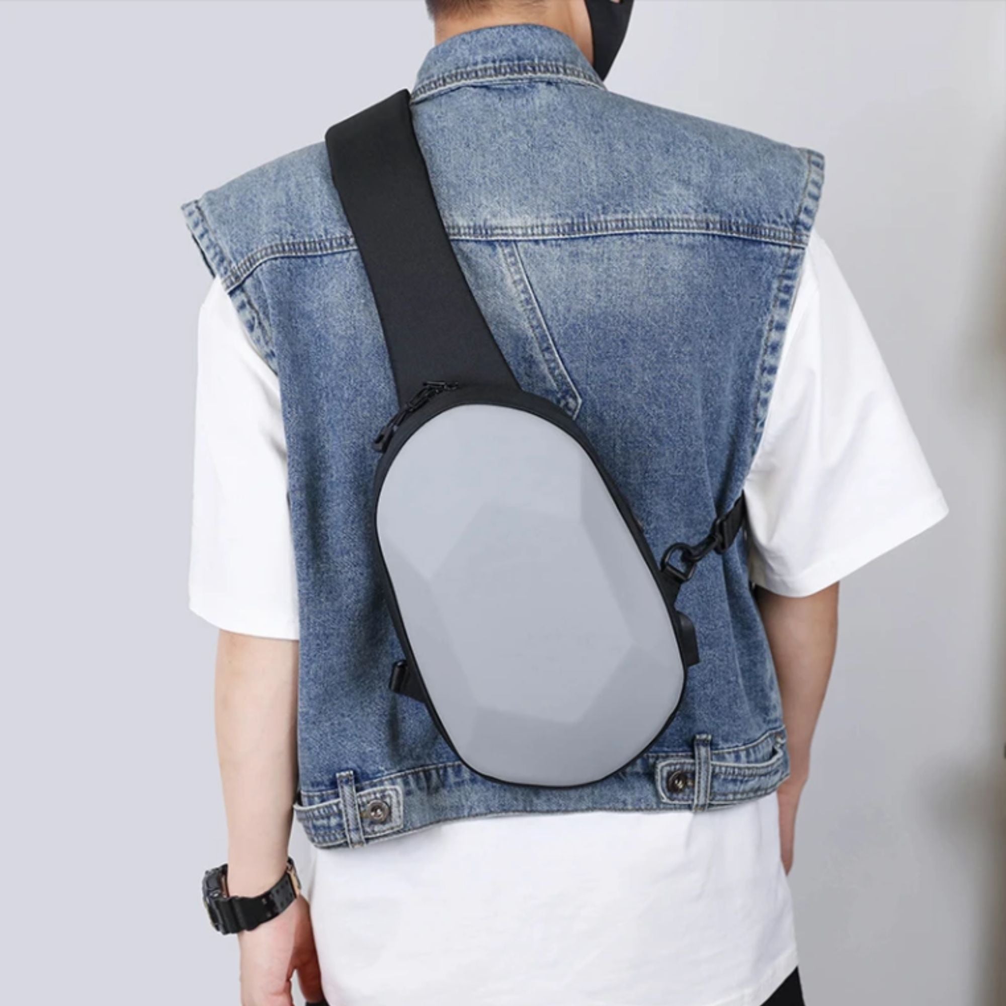 Fabricado con material Oxford de alta calidad y resistente al agua, tus pertenencias estarán seguras y secas, incluso en días lluviosos. Su diseño de carcasa rígida con facetas geométricas le confiere un aspecto futurista y protege tus dispositivos de golpes.