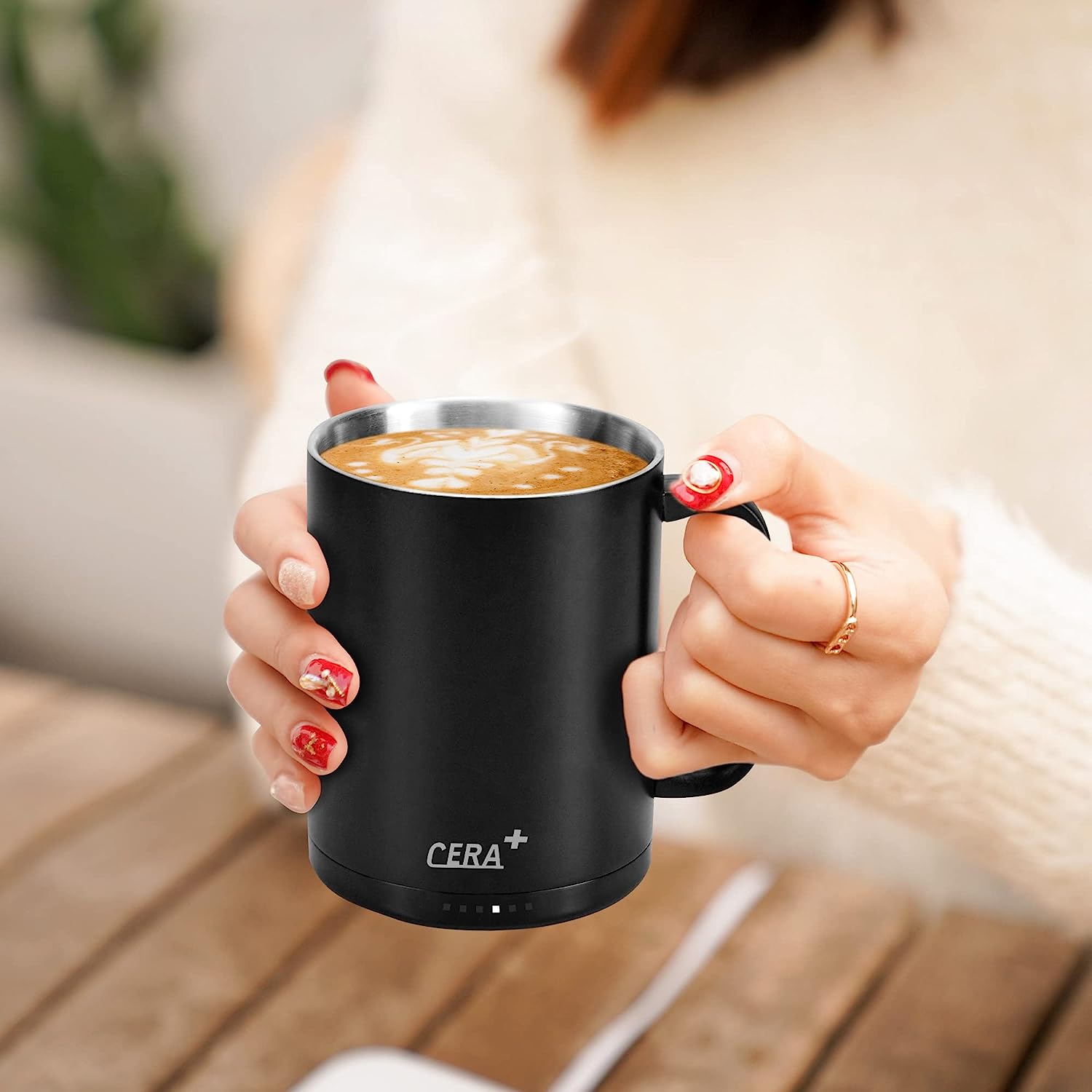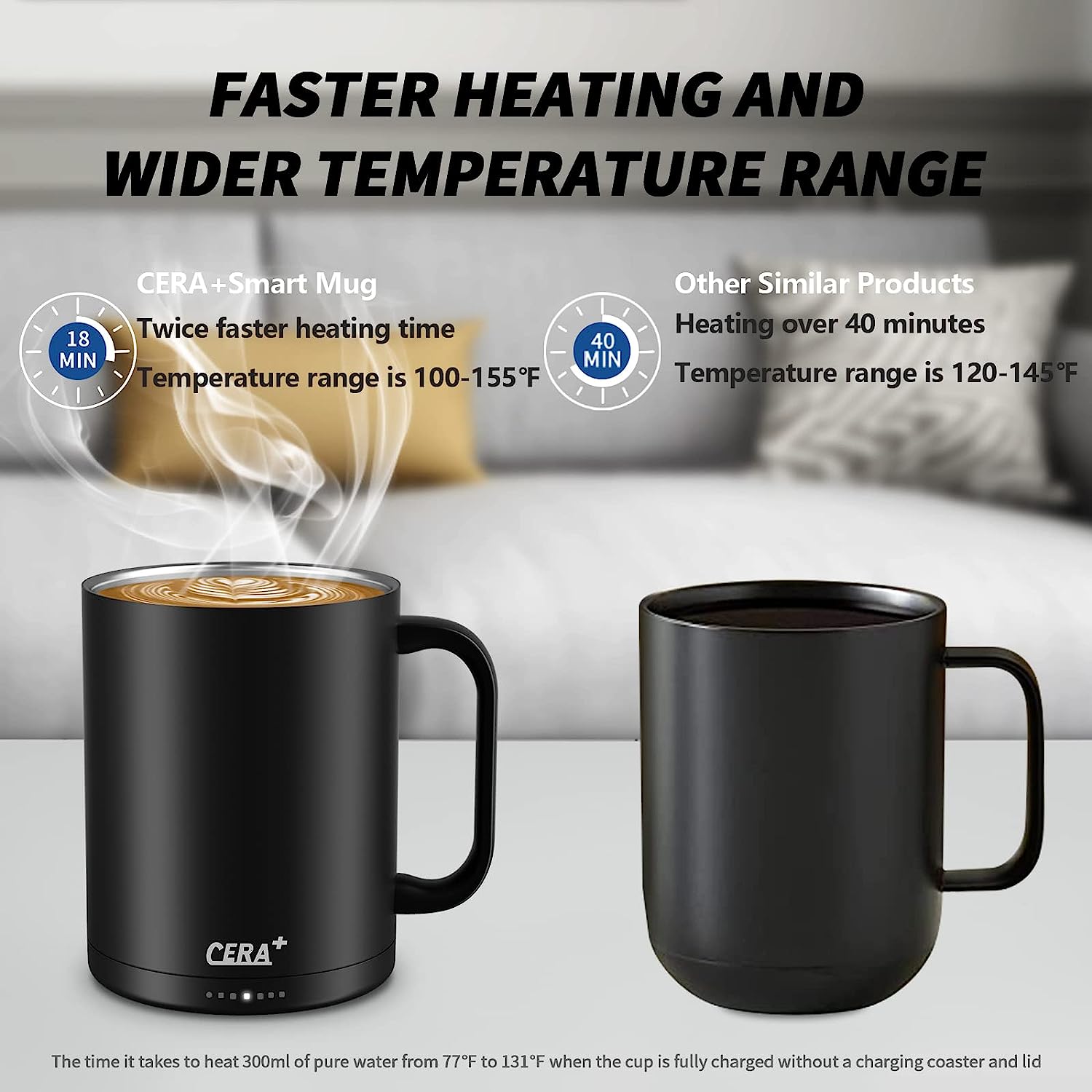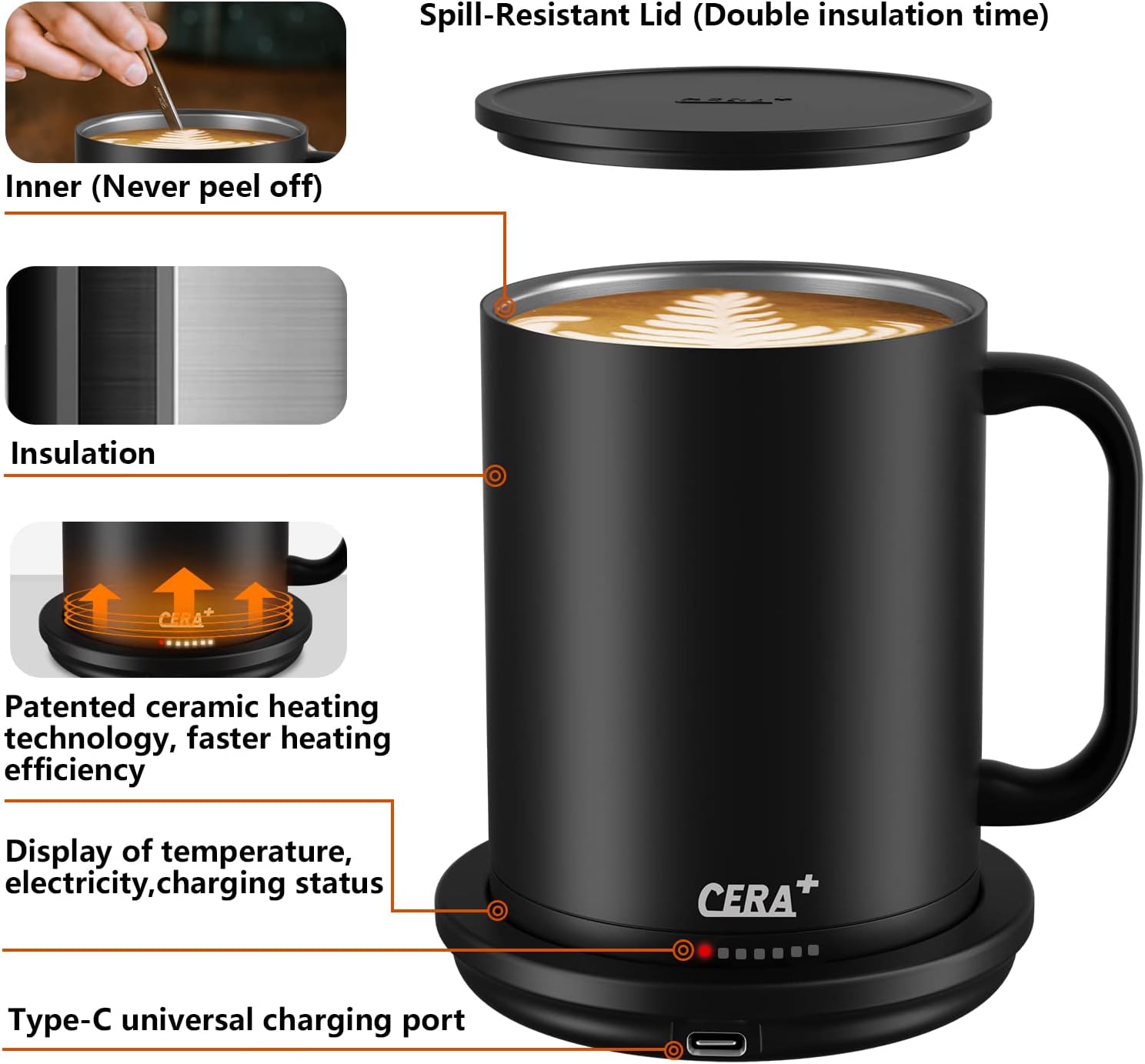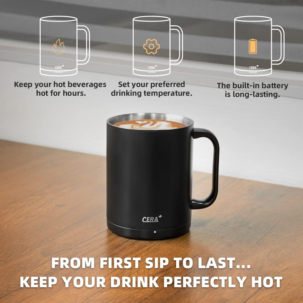 - Tecnología de calefacción patentada: con una tecnología patentada de calefacción de cerámica, la taza inteligente CERA+ es dos veces más rápida que otros productos similares; se puede calentar sin posavasos. Cuando no hay agua, la taza detendrá automáticamente el calentamiento para mayor seguridad. Puede mantener la bebida caliente todo el día cuando está en el posavasos de carga, y solo 20 minutos calentados de agua a temperatura ambiente a 135 °F. El rango de temperatura de calefacción es de 100-155 °F. Una taza completa de bebida puede mantener 60-80 minutos calientes, y doble tiempo de calentamiento con tapa.