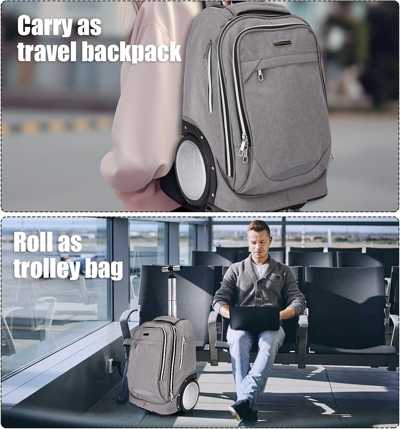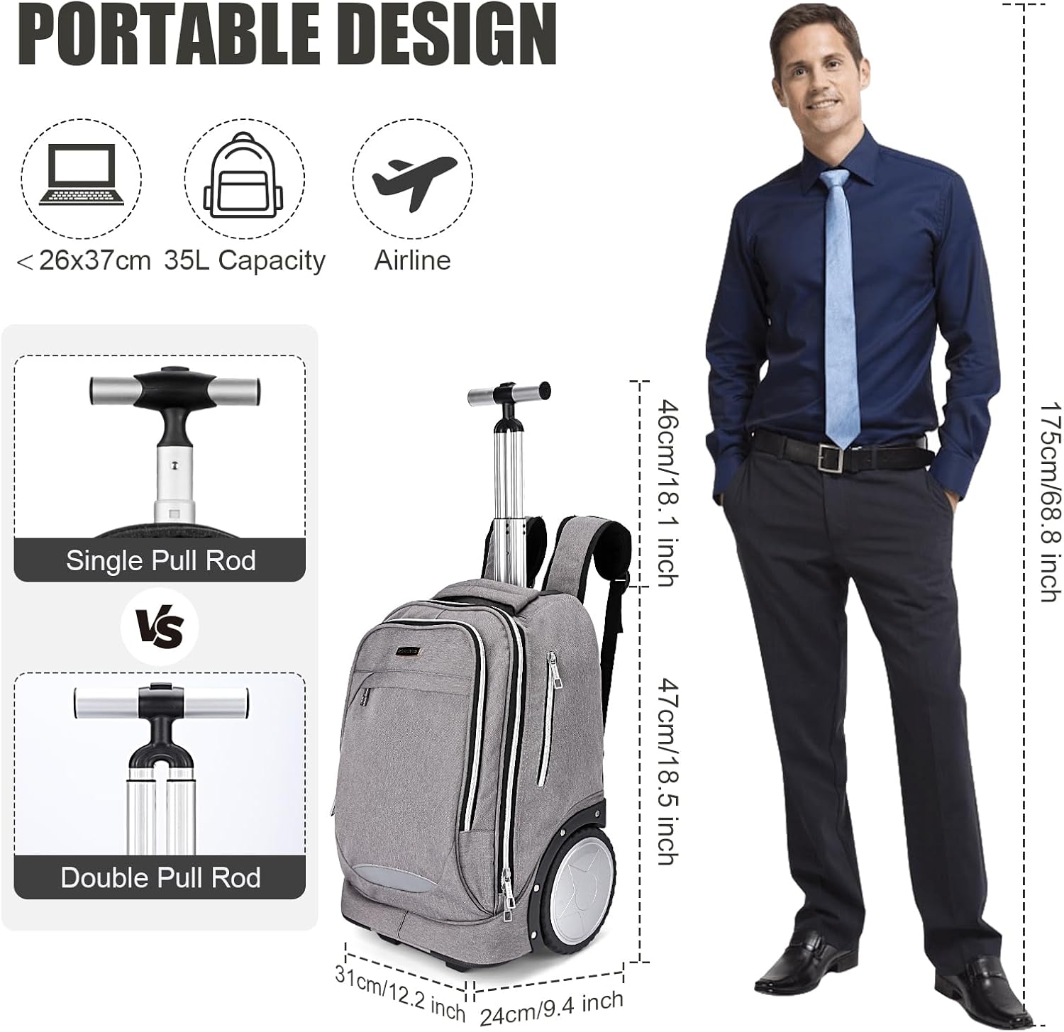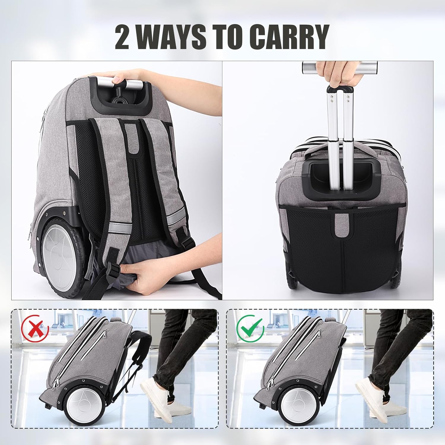 - Maleta y mochila 2 en 1: con un mango telescópico, ruedas grandes y resistentes y correas de hombro extraíbles, puede cambiar fácilmente entre una mochila de computadora y una mochila con ruedas. En modo rodante, guarda las correas de los hombros en los bolsillos y no más arrastrar al enrollar la mochila. Al cambiar al modo mochila, libera tus manos, y las correas de hombro de malla transpirable están equipadas con un amplio acolchado de esponja para que te sientas cómodo.