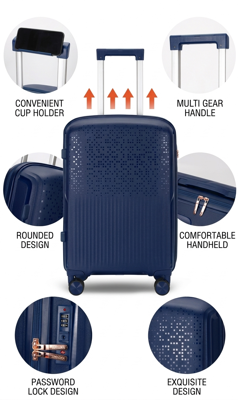 Maletas Extra Livianas y Sólidas de Diseño Contemporáneo y Funcional. Tienen Cuatro Ruedas de diseño Aeronáutico, Multi- Direccionales de 360 Grados y Silenciosas, Para poder mover la maleta sin ningún esfuerzo. Traen Cerraduras Incorporadas de Combinación de tres Dígitos. Asa Metálica Superior Retráctil para Sistema Autoportable, con botón de presión y mango ergonómico.