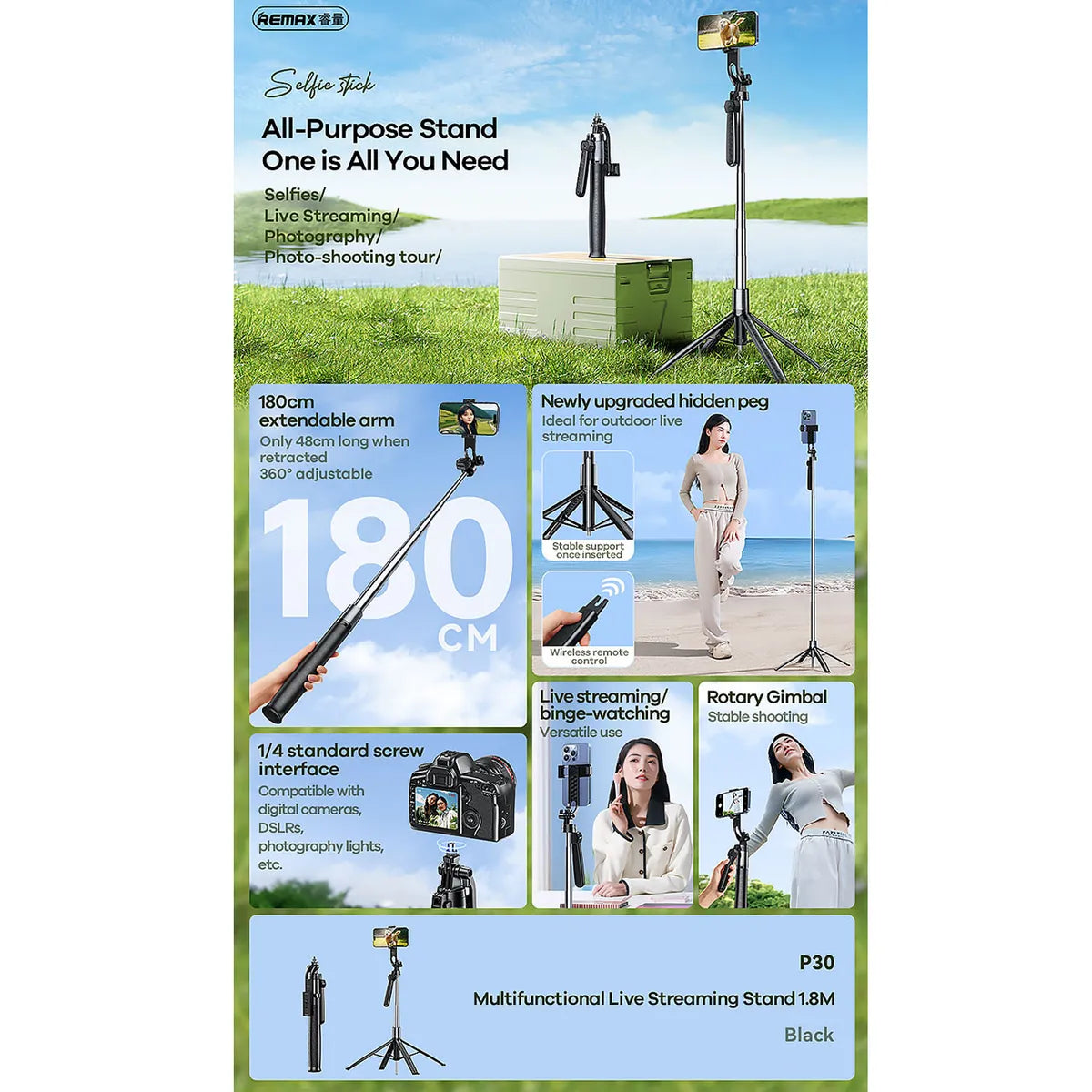 El soporte multifuncional REMAX P30 es la herramienta definitiva para creadores de contenido, streamers y vloggers. Este soporte te permite colocar tu smartphone en la posición perfecta para transmisiones en vivo, videollamadas, tutoriales y más. Con su iluminación integrada y su diseño ajustable, obtendrás el mejor ángulo y la iluminación ideal para tus creaciones.