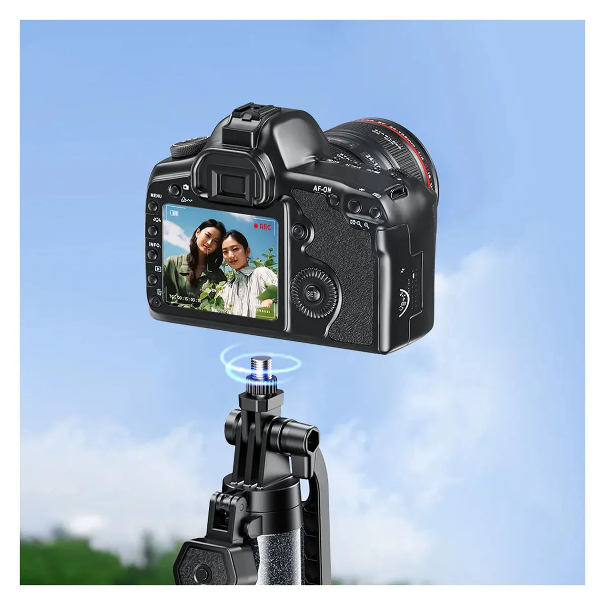 Es extensible hasta 1.8 m, permitiéndote ajustar ángulos altos o bajos con facilidad. El soporte gira 360° y cuenta con seguimiento automático de rostros, ideal para grabarte mientras te mueves.
