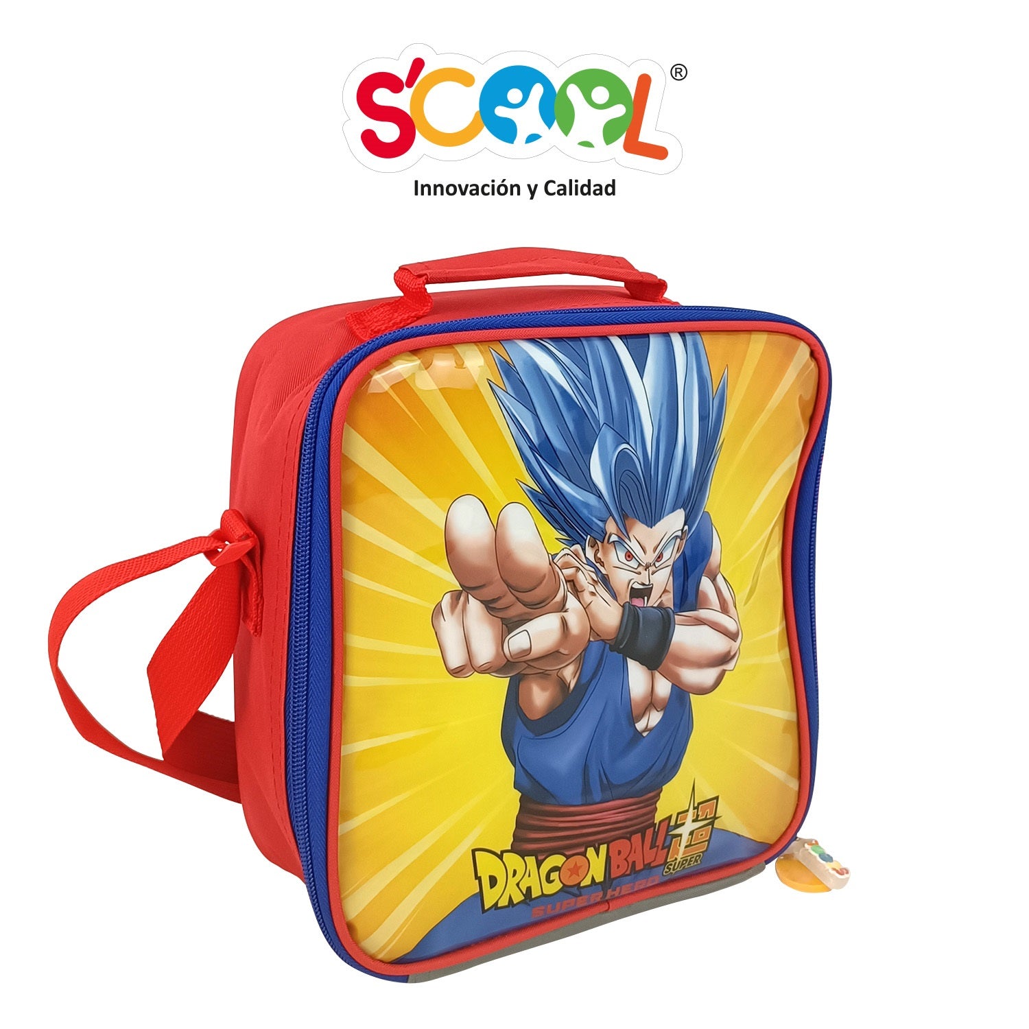 - Lonchera tela cuadrada con interior térmico y correa regulable.